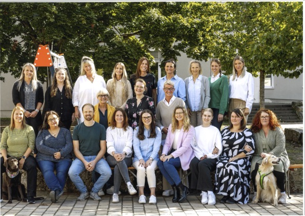 Vordere Reihe: Frau Worm + Wilma, Frau Rousseau, Herr Reimer, Frau Engler, Frau Ilse, Frau Kraft, Frau Noll, Frau Lorenz, Frau Troyke + Floyd.